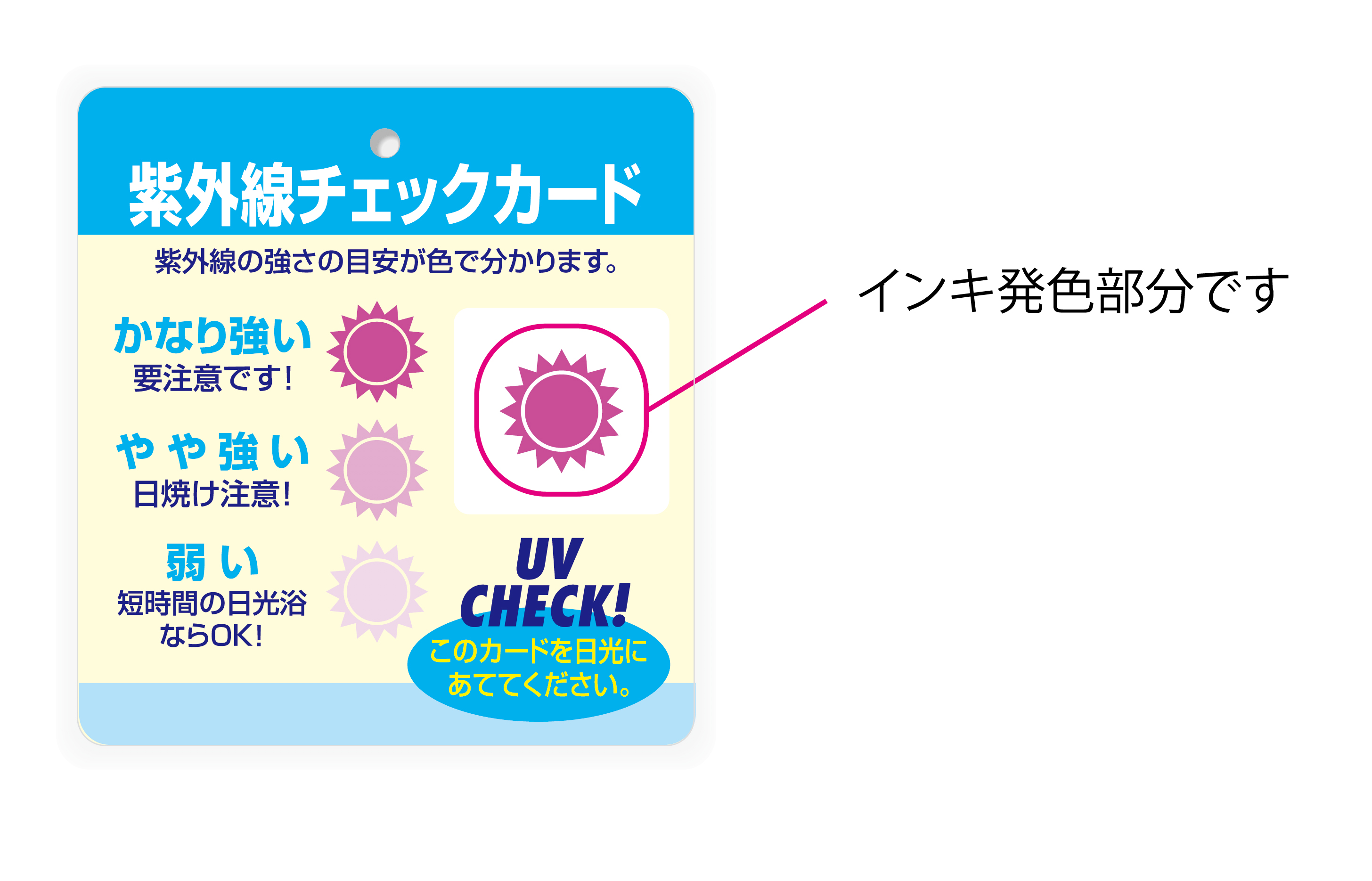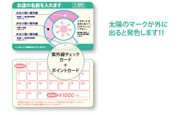 紫外線チェックカード UVチェッカー・紫外線チェックシート・紫外線チェックカード見本 UVチェッカー・紫外線チェックシート・紫外線チェックカードなどと言われています。「紫外線チェックカード」は、表面に紫外線に反応する特殊インキで印刷してあり、紫外線の量により色の濃さが変わります。 紫外線の量を手軽にチェックできるカードで、紫外線の量があるか目安としてお使いいただけます。また、光をさえぎることにより、元の色に戻り何度でも使用することが出来ます。 発色インキカラー見本弊社が取り扱いる紫外線チェックカードのインキ部分のカラー見本です。 インキ発色パターン発色印刷は紫外線を当てると発色する機能を持つ弊社の機能性インキを使用した機能性印刷です。 紫外線チェック発色インクについて 紫外線チェック発色インクは紫外線チェックカードの発色インクは非常に高額なため発色部分のデザインは通常2cm✕2cm以下に抑えるのがスタンダードなサイズになります。紫外線の量により、太陽の部分の色が変わります。 紫外線チェックカード印刷の特徴 目では見えない紫外線を利用して、視覚効果のある演出をすることができます。太陽に当てると紫外線を認識して発色しますので、美容関係のノベルティー、サングラス関係のノベルティー、その他ノベルティーに最適なアイテムになります。 紫外線チェックカード印刷の注意点 下地の色によっては発色が確認しづらい場合があります。保管環境によって色の変化が多少変化いたしますので、厳密な紫外線測定などはできません。光学波長は300nm〜380nmに反応いたしますが、発色等に対しての保証などはございません。 紫外線チェックカード+ポイントカード UVチェッカー・紫外線チェックシート・紫外線チェックカードは通常100円ショップなどで売られているノベルティ商品(紫外線チェックカード、ヘルスチェックカードなど)を、下げ札やポイントカードのサービス品として付加価値をつけてオリジナルデザイン提案致します。特殊ノベルティ商品などの独自のイメージを演出し御社の広告媒体に活躍します。 企画 管理 発送 紫外線チェックカードお見積り 紫外線チェツクカード紙厚(※必須事項) サンカード22.5kg サンカード25kg 色数・片面(※必須事項) 1色 2色 3色 4色フルカラー 色数・裏面(※必須事項) 裏面無し 1色 2色 3色 4色フルカラー ロット(※必須事項) サイズ(全判)包装紙用 メールアドレス(※必須事項) 会社名(※必須事項) お名前(※必須事項) 性 別 男 女 郵便番号(郵便番号フィールド) 〒 - 都道府県(セレクトボックス) 北海道 青森県 岩手県 宮城県 秋田県 山形県 福島県 茨城県 栃木県 群馬県 埼玉県 千葉県 東京都 神奈川県 新潟県 富山県 石川県 福井県 山梨県 長野県 岐阜県 静岡県 愛知県 三重県 滋賀県 京都府 大阪府 兵庫県 奈良県 和歌山県 鳥取県 島根県 岡山県 広島県 山口県 徳島県 香川県 愛媛県 高知県 福岡県 佐賀県 長崎県 熊本県 大分県 宮崎県 鹿児島県 沖縄県 ご住所(※必須事項) お電話番号(※必須事項) - - お問合せ内容(※必須事項) 確認画面へ進むボタン お問合せはこちら